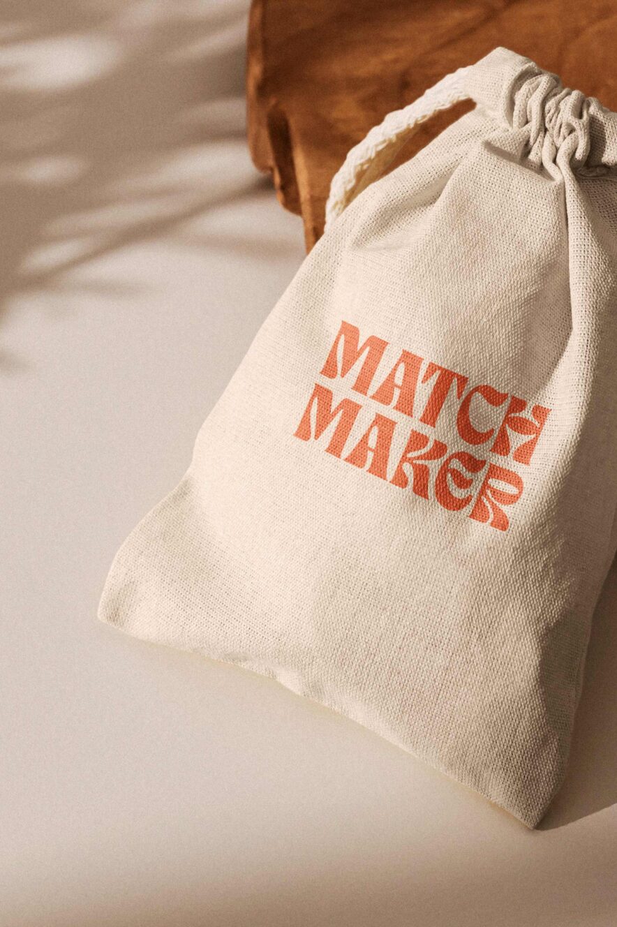 Roonie was tasked to develop a brand identity that is playful and bold. Using a modified1970s-inspired typeface, the brand marries modern and retro design sensibilities.Matchmaker is imbued with a peachy palette, which pairs beautifully with its clean and warm product photography. The brand literally wears its heart on its sleeve. So, we ensured the packaging design upheld Matchmaker’s commitment to sustainability; with custom packing tape that has non-toxic adhesives, reusable drawstring bags and collateral that can be composted or recycled after use. In addition to its selection of rare and beautiful pieces,Matchmaker now has a brand that showcases these gems in their very best light.